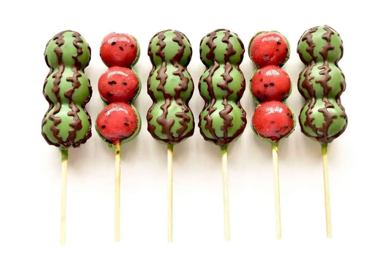 به کمک قلم مو و رنگ خوراکی سبز روی هر شکلات، خطوطی مشابه خطوط روی هندوانه ایجاد کنید.
